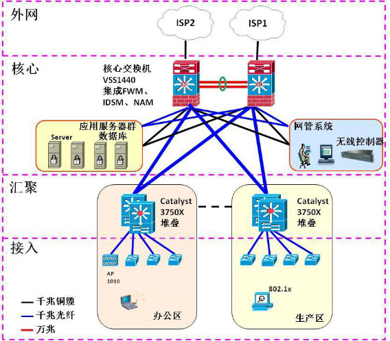 对于企业生产网络的核心层,我们建议采用思科部署在 Catalyst 6500 交换机 平台上的虚拟交换系统(VSS)技术进行构建。
